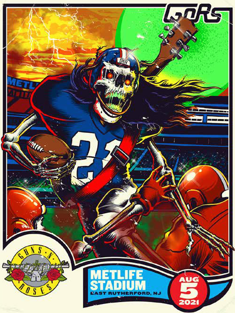 Metlife Stadium is home to two NFL football teams and the skeleton in the design wears a uniform very similar to one of them - the New York Giants.