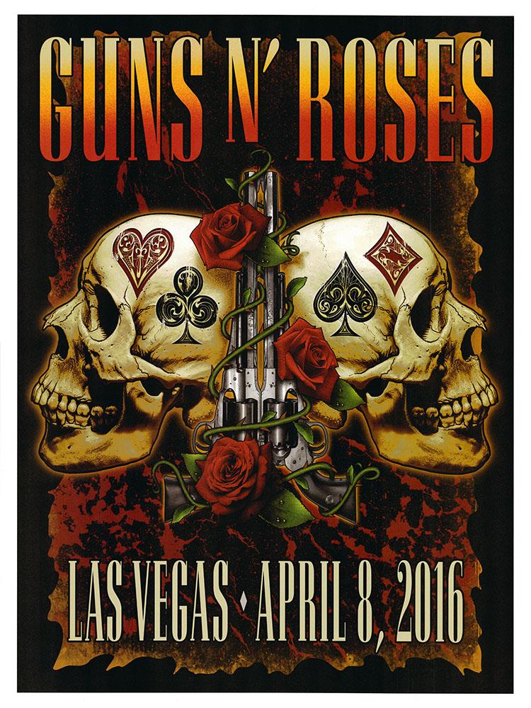 four card suits as reference to the gambling location of Las Vegas. The motif of including guns, roses and skull imagery would become fairly standard over the course of the tour. |