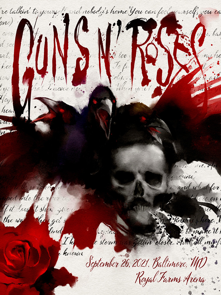 the city under somewhat mysterious circumstances. The background text are the lyrics for "Estranged" from Use Your Illusion II. |