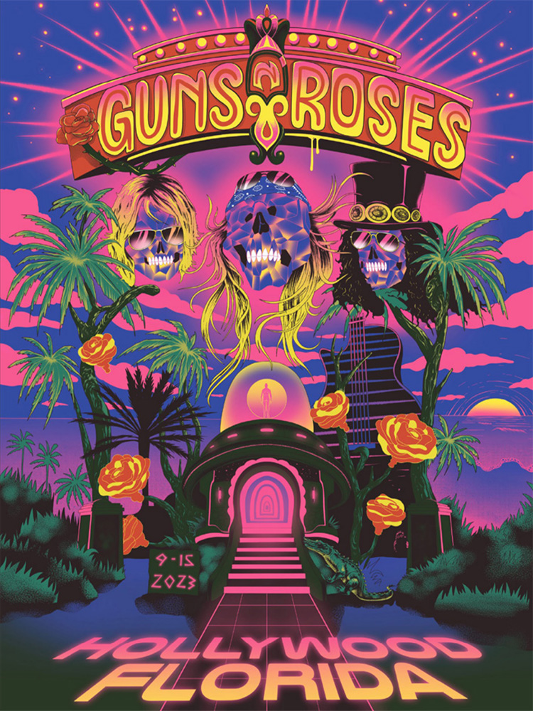 The lithograph combines the artist's iconic psychedelic style with a vaporwave aesthetic and features the Seminole Hard Rock Hotel & Casino.