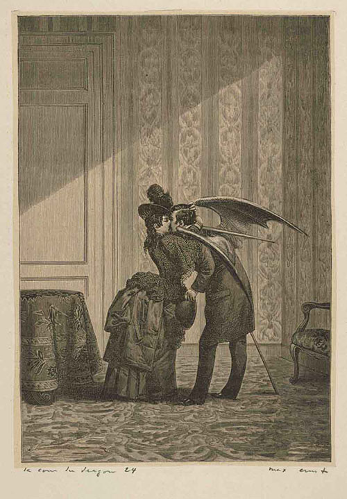 Reference: The kissing figures are a reference to one of the many images found in "Une Semaine de Bonté" by Max Ernst.