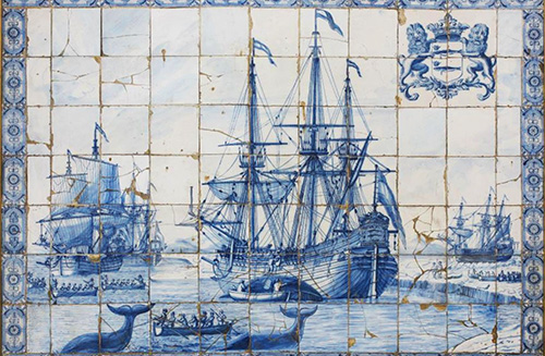The lithograph depicts the famous glazed tile pattern known as Delftware, made in and around the Delft region of the Netherlands.