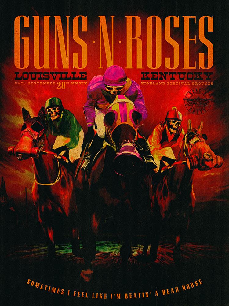 references Louisville's famous Kentucky Derby. Lithograph was for the Louder Than Life Festival in Louisville, Kentucky. Lithograph was sold prematurely on September 27. Although Guns N' Roses were scheduled to perform on September 28, the second day of the 3-day Louder Than Life Festival, sales of merchandise including the lithograph commenced on opening day. |