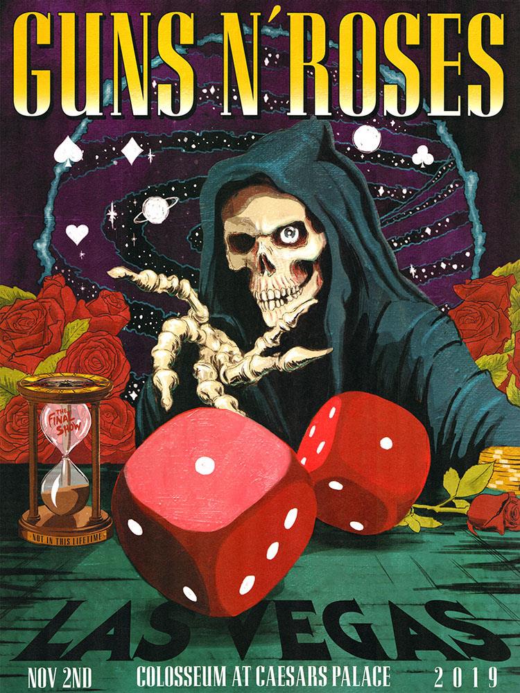 another (hitherto unknown) artist. The hourglass running out and 'snake-eyes' dice both represent the end of the Not in This Lifetime tour. |